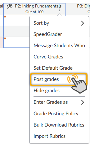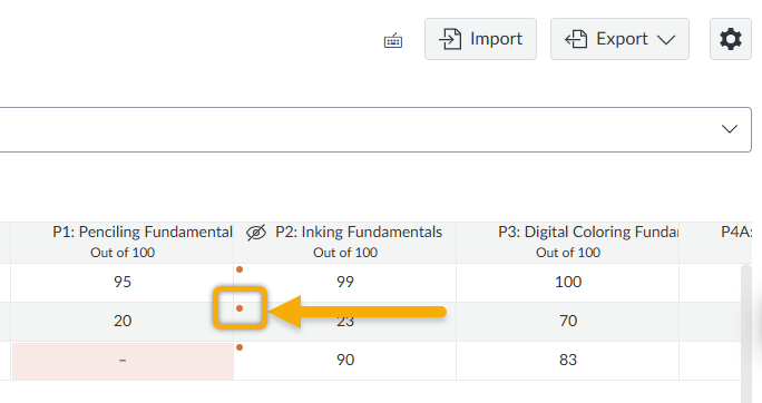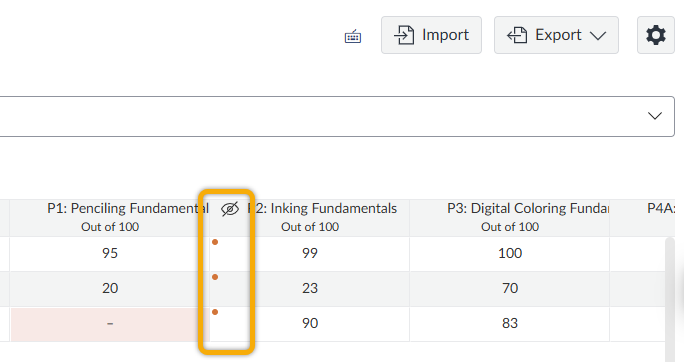 - A dot will appear next to each grade in the column, confirming they are hidden from students.