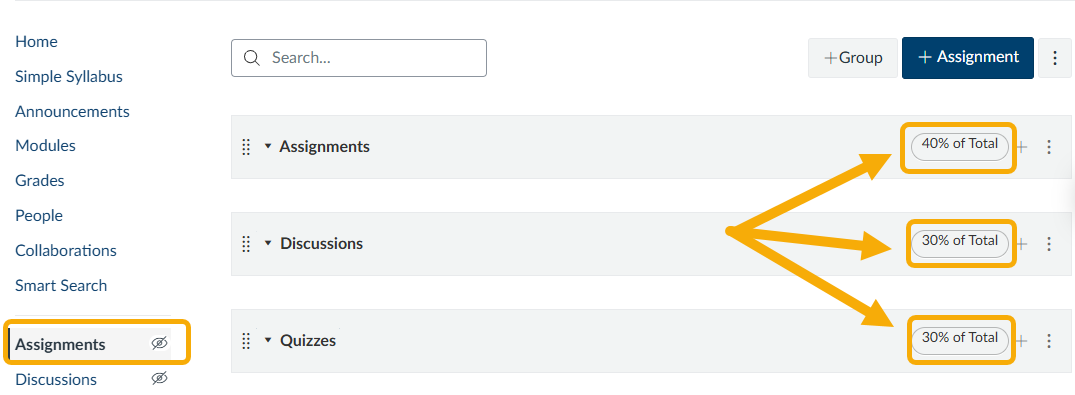 - Go to Assignments and make sure you do, in fact, have a weighted gradebook. You should see all of your assignments divided into groups, and each group should say __% of total. The total should be 100%.