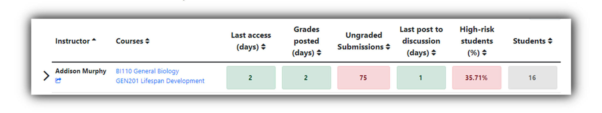 If an instructor is teaching multiple courses, the number and percentage displayed on the summary screen will be the highest of any course that they are currently teaching. In the screenshot below, Addison Murphy is teaching two courses. She last accessed her courses 2 days ago, last posted grades 2 days ago, has 75 ungraded submissions, last posted to a discussion one day ago, and 35.71 of her students are classified as high risk. This screen is intended to be a summary across multiple courses so that you may identify instructors who may need closer review. To view the 'days since' for each individual course, please click on the arrow next to the instructor's name.