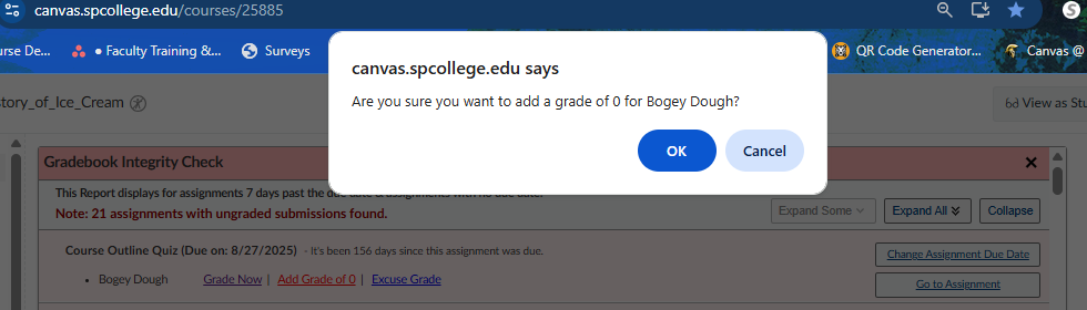 Add Grade of 0: This can be used to quickly add zero to the gradebook and forgo using SpeedGrader or having to locate the assignment in Gradebook.