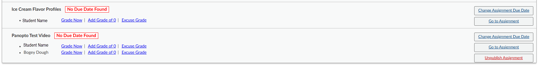 Some assignments with have an Identifier in Red text. These are "No Due Date Found" and "Unpublish Assignment."