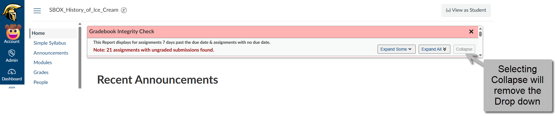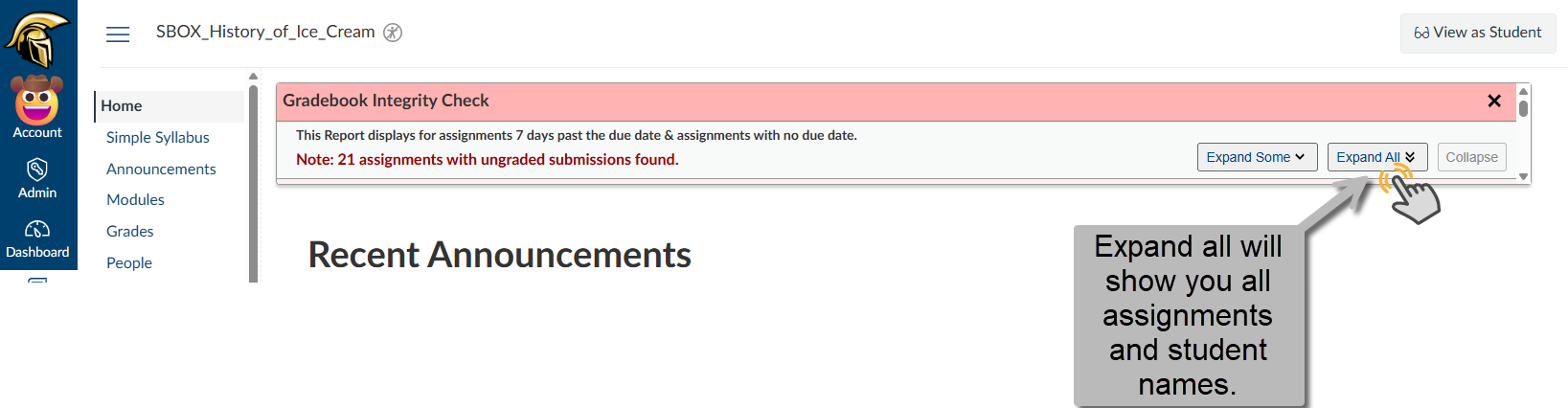 - clicking Expand All will show the entire list of Ungraded Assignments and Student names.