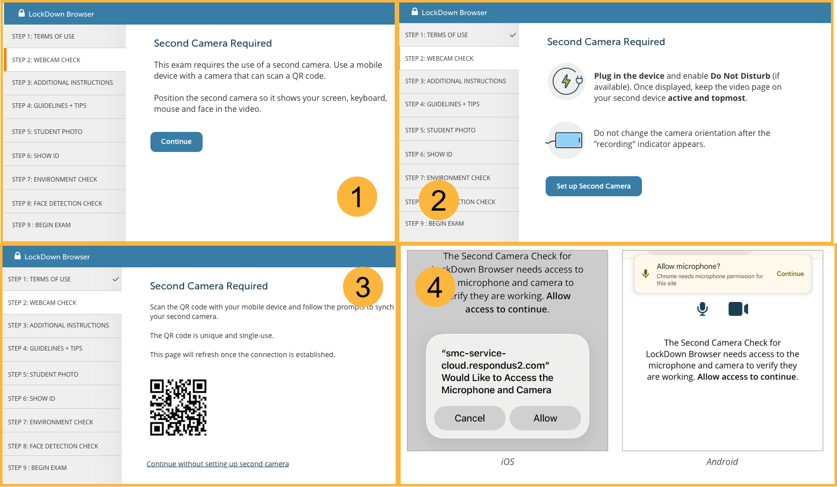 Respondus Monitor allows instructors to require students to use a second camera during an exam. This provides an additional view of the student’s testing environment using a mobile device (phone or tablet), in addition to the student’s primary webcam.